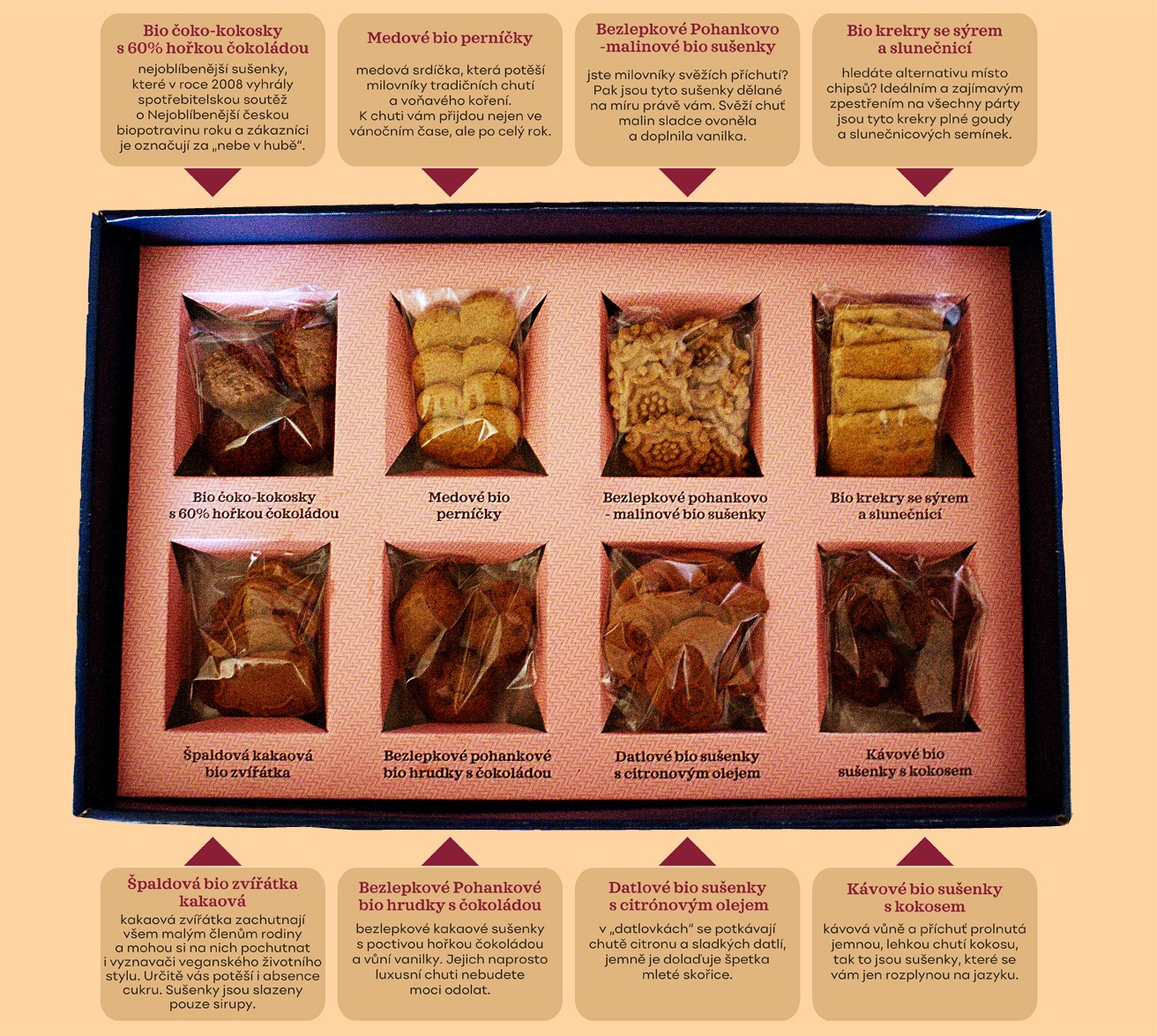 Krabice obsahuje osm druhů sušenek a krekrů, které vás provedou napříč chutěmi našeho portfolia. Objevíte zde čtyři nejoblíbenější sladké druhy, jeden slaný, ochutnávku dětského pečiva a dva druhy bezlepkové.